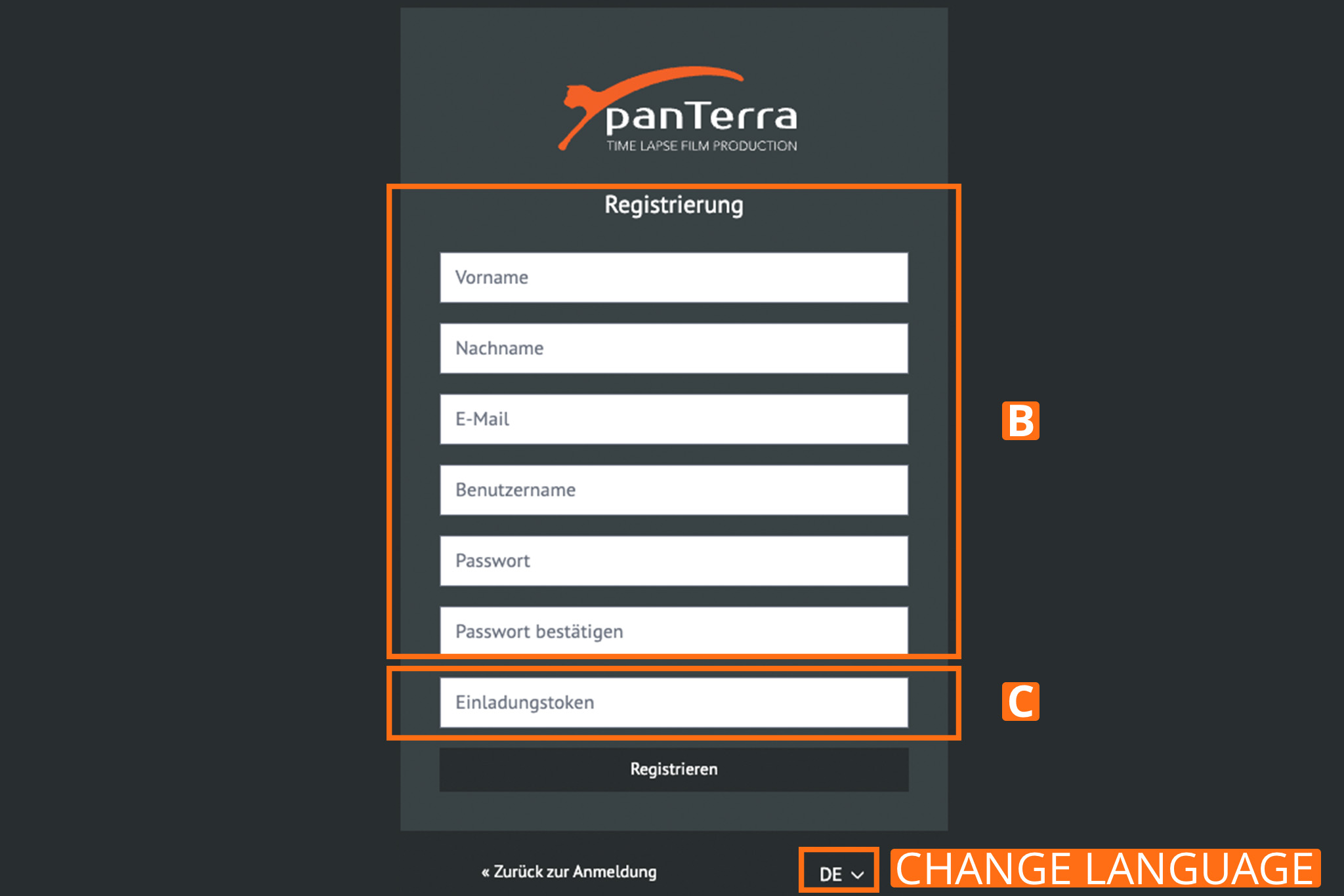 4. Tragen Sie den von panTerra übermittelten Einladungstoken ein (verknüpft Ihren Zugang mit dem Projekt) C.